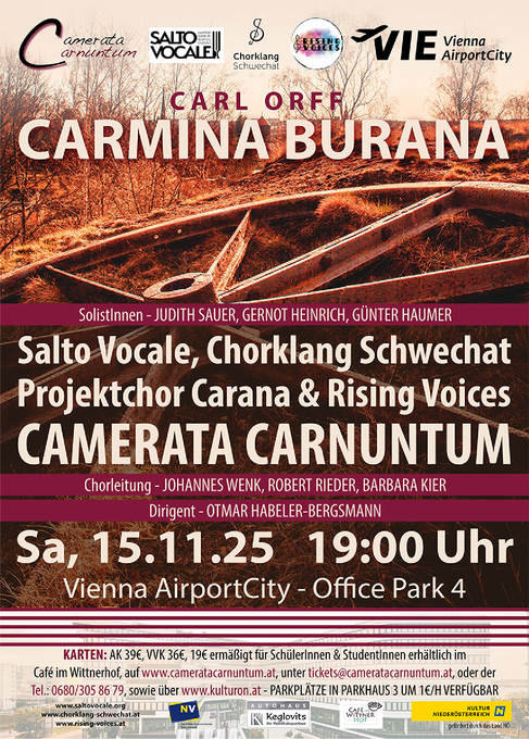Am 15.11.2025 dürfen wir gemeinsam mit Salto Vocale, den Rising Voices und dem Orchester Camerata Carnuntum unter der Gesamtleitung von Otmar Habeler-Bergsmann die Carmina Burana am Flughafen Wien aufführen.